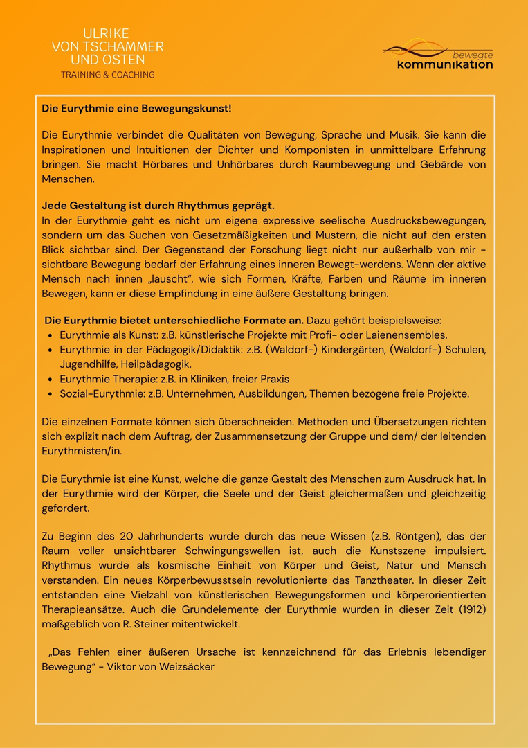 Die Methode der Bewegten Kommunikation vermittelt ein unmittelbares Verständnis für zwischenmenschliche Interaktion: ohne überflüssige Worte und am eigenen Körper erlebbar. Sie ist damit eine